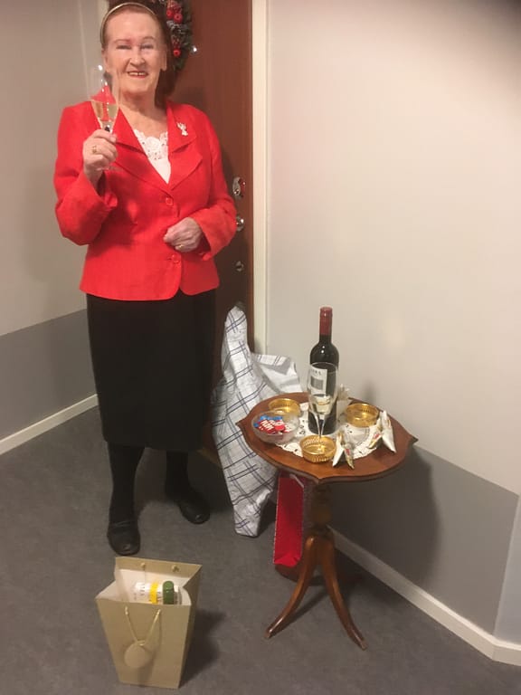 Den 5 januari fyllde Elly 90 år och tog cororonaanpassat emot sina gäster några i taget utanför sin lägenhet.